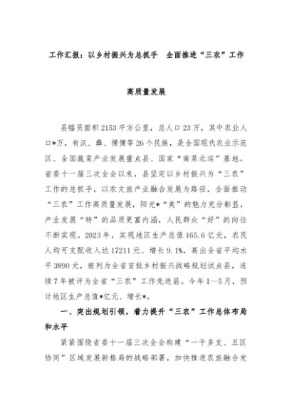 【七哥公文】2024年:工作汇报:以乡村振兴为总抓手 全面推进“三农”工作高质量发展+更多免费公文+VX:QiGeGongWen2024