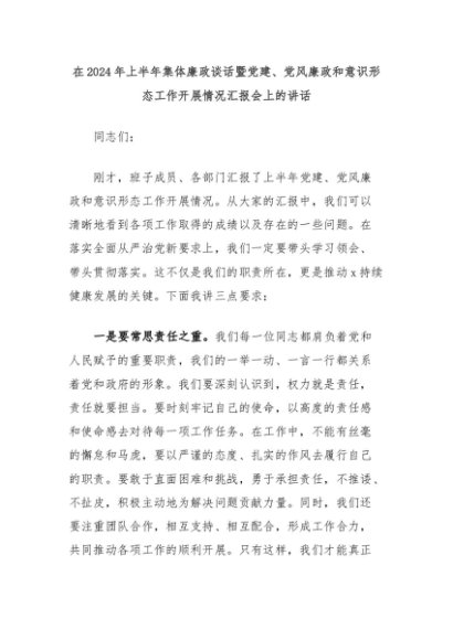 【七哥公文】2024年:在2024年上半年集体廉政谈话暨党建、党风廉政和意识形态工作开展情况汇报会上的讲话+更多免费公文+VX:QiGeGongWen2024