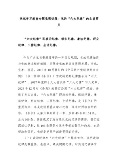 【七哥公文】2024年:党纪学习教育专题党课讲稿:党的“六大纪律”的主旨要义+更多免费公文+VX:QiGeGongWen2024
