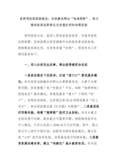 【七哥公文】2024年:县两项改革经验做法:切实解决群众“急难愁盼”,努力推动改革成果转化为发展红利和治理实效+更多免费公文+VX:QiGeGongWen2024