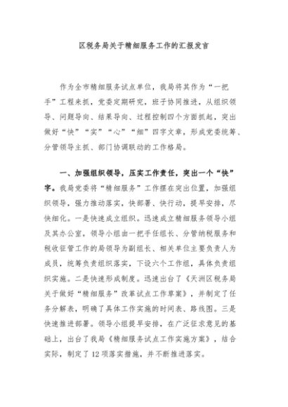 【七哥公文】2024年:区税务局关于精细服务工作的汇报发言+更多免费公文+VX:QiGeGongWen2024