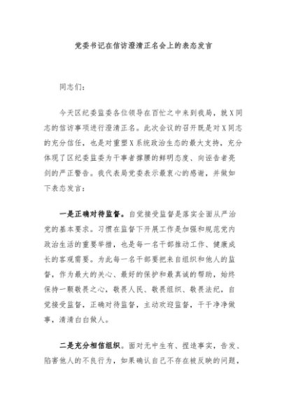 【七哥公文】2024年:党委书记在信访澄清正名会上的表态发言+更多免费公文+VX:QiGeGongWen2024