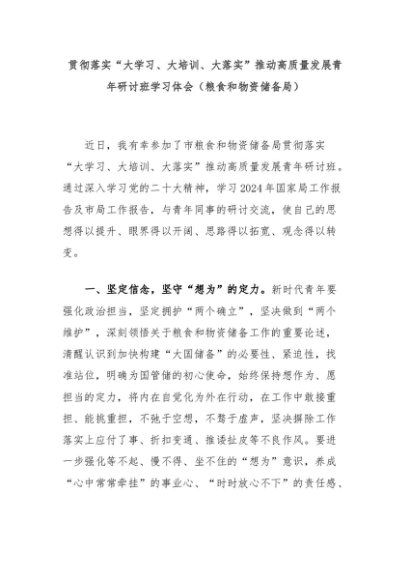 【七哥公文】2024年:贯彻落实“大学习、大培训、大落实”推动高质量发展青年研讨班学习体会(粮食和物资储备局)+更多免费公文+VX:QiGeGongWen2024