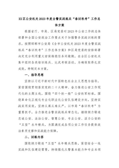 【七哥公文】2024年:XX区公安机关2023年度全警实战练兵“春训秋考”工作总体方案+更多免费公文+VX:QiGeGongWen2024