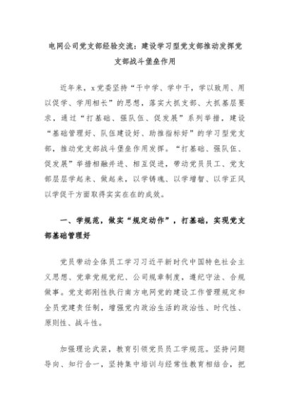【七哥公文】2024年:电网公司党支部经验交流:建设学习型党支部推动发挥党支部战斗堡垒作用+更多免费公文+VX:QiGeGongWen2024