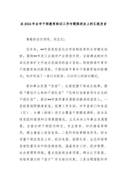 【七哥公文】2024年:在2024年全市干部教育培训工作专题推进会上的汇报发言+更多免费公文+VX:QiGeGongWen2024