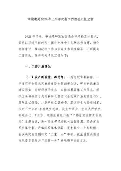/ 【七哥公文】2024年:市城建局2024年上半年纪检工作情况汇报发言+更多免费公文+VX:QiGeGongWen2024