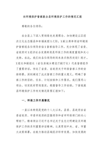 / 【七哥公文】2024年:向环境保护督察就全县环境保护工作的情况汇报+更多免费公文+VX:QiGeGongWen2024
