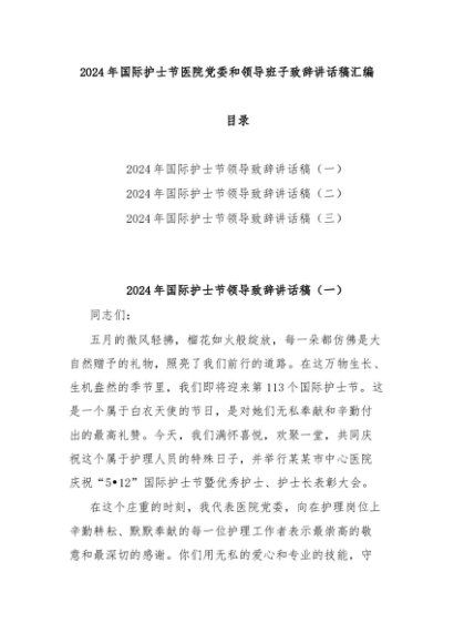 【七哥公文】2024年:2024年国际护士节医院党委和领导班子致辞讲话稿汇编+更多免费公文+VX:QiGeGongWen2024
