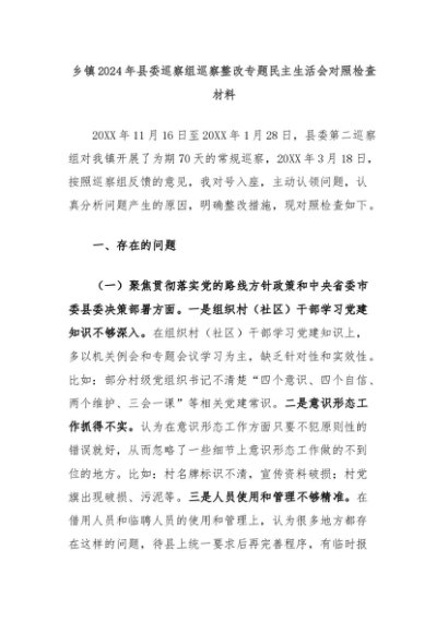 【七哥公文】2024年:乡镇2024年县委巡察组巡察整改专题民主生活会对照检查材料+更多免费公文+VX:QiGeGongWen2024