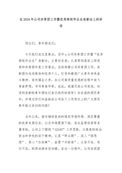 【七哥公文】2024年:在2024年公司共青团工作暨优秀高校毕业生表彰会上的讲话+更多免费公文+VX:QiGeGongWen2024