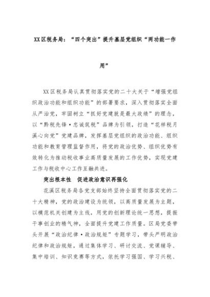 【七哥公文】2024年:XX区税务局:“四个突出”提升基层党组织“两功能一作用”+更多免费公文+VX:QiGeGongWen2024