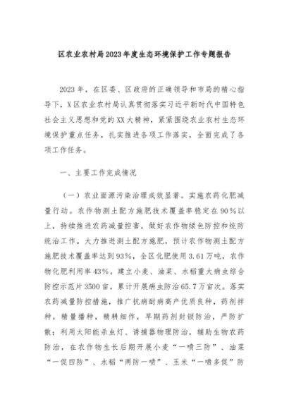 / 【七哥公文】2024年:区农业农村局2023年度生态环境保护工作专题报告+更多免费公文+VX:QiGeGongWen2024