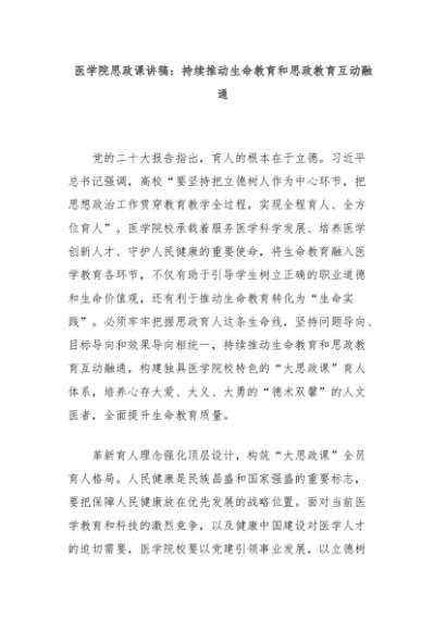 【七哥公文】2024年:医学院思政课讲稿:持续推动生命教育和思政教育互动融通+更多免费公文+VX:QiGeGongWen2024