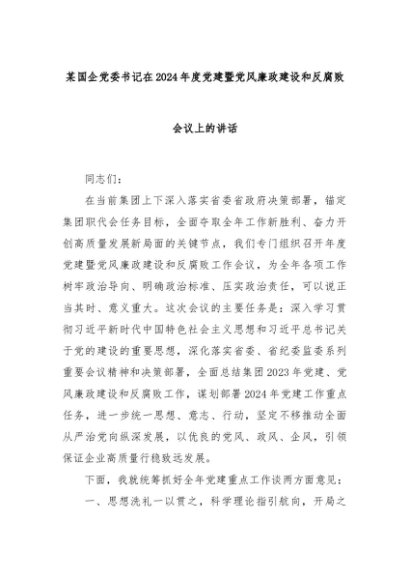 【七哥公文】2024年:某国企党委书记在2024年度党建暨党风廉政建设和反腐败会议上的讲话+更多免费公文+VX:QiGeGongWen2024