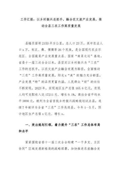 【七哥公文】2024年:工作汇报:以乡村振兴总抓手,融合农文旅产业发展,推动全县三农工作高质量发展+更多免费公文+VX:QiGeGongWen2024