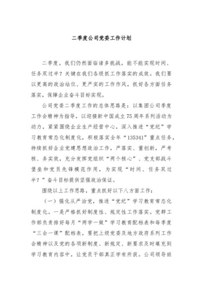 / 【七哥公文】2024年:二季度公司党委工作计划+更多免费公文+VX:QiGeGongWen2024