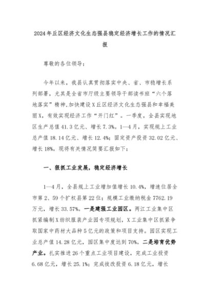 【七哥公文】2024年:2024年丘区经济文化生态强县稳定经济增长工作的情况汇报+更多免费公文+VX:QiGeGongWen2024