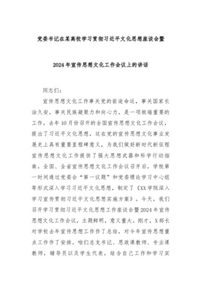 【七哥公文】2024年:党委书记在某高校学习贯彻习近平文化思想座谈会暨2024年宣传思想文化工作会议上的讲话+更多免费公文+VX:QiGeGongWen2024
