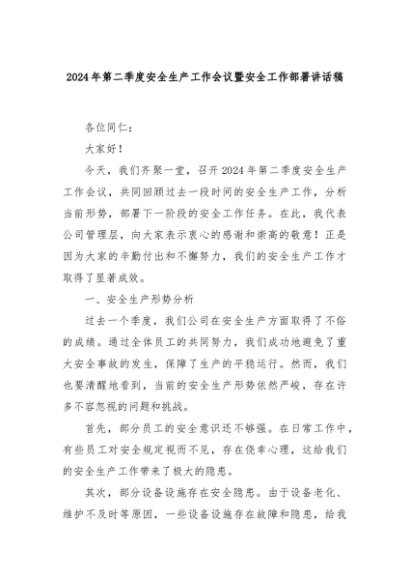 【七哥公文】2024年:2024年第二季度安全生产工作会议暨安全工作部署讲话稿+更多免费公文+VX:QiGeGongWen2024