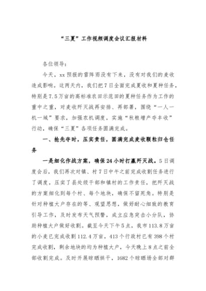 / 【七哥公文】2024年:“三夏”工作视频调度会议汇报材料+更多免费公文+VX:QiGeGongWen2024