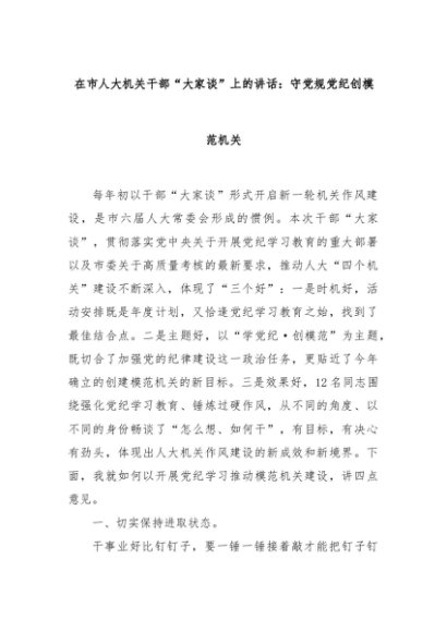 【七哥公文】2024年:在市人大机关干部“大家谈”上的讲话:守党规党纪创模范机关+更多免费公文+VX:QiGeGongWen2024