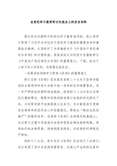 / 【七哥公文】2024年:在党纪学习教育研讨交流会上的发言材料+更多免费公文+VX:QiGeGongWen2024