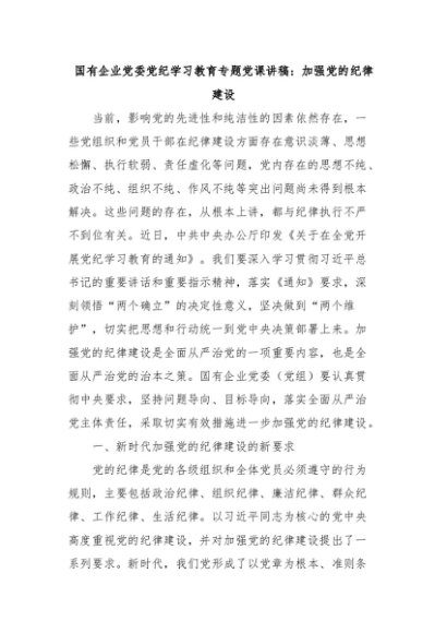 【七哥公文】2024年:国有企业党委党纪学习教育专题党课讲稿:加强党的纪律建设+更多免费公文+VX:QiGeGongWen2024