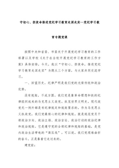 【七哥公文】2024年:守初心、担使命推进党纪学习教育走深走实—党纪学习教育专题党课+更多免费公文+VX:QiGeGongWen2024