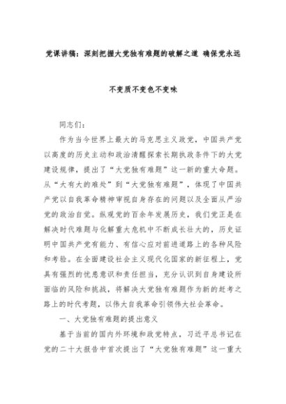 【七哥公文】2024年:党课讲稿:深刻把握大党独有难题的破解之道 确保党永远不变质不变色不变味+更多免费公文+VX:QiGeGongWen2024