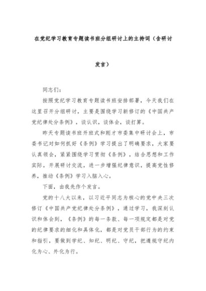 【七哥公文】2024年:在党纪学习教育专题读书班分组研讨上的主持词(含研讨发言)+更多免费公文+VX:QiGeGongWen2024