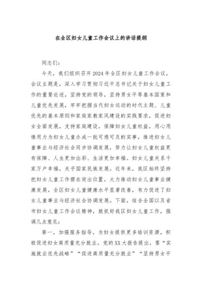 / 【七哥公文】2024年:在全区妇女儿童工作会议上的讲话提纲+更多免费公文+VX:QiGeGongWen2024