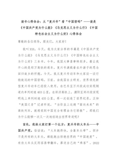 【七哥公文】2024年:读书心得体会:从“复兴号”看“中国密码”——读是《中国共产党为什么能》《马克思主义为什么行》《中国特色社会主义为什么好》心得体会+更多免费公文+VX:QiGeGongWen2024