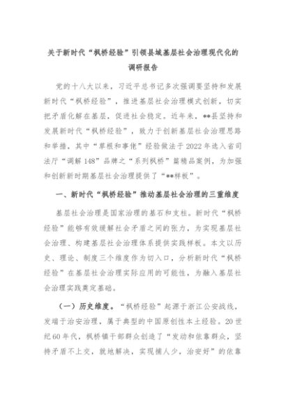【七哥公文】2024年:关于新时代“枫桥经验”引领县域基层社会治理现代化的调研报告+更多免费公文+VX:QiGeGongWen2024