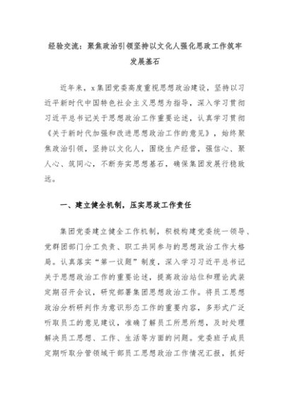【七哥公文】2024年:经验交流:聚焦政治引领坚持以文化人强化思政工作筑牢发展基石+更多免费公文+VX:QiGeGongWen2024
