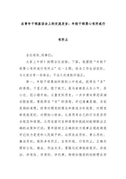 【七哥公文】2024年:在青年干部座谈会上的交流发言:年轻干部要心有所戒行有所止+更多免费公文+VX:QiGeGongWen2024