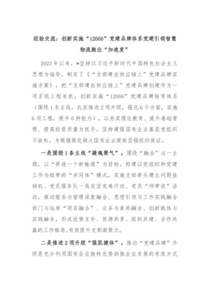 【七哥公文】2024年:经验交流:创新实施“12666”党建品牌体系党建引领智慧物流跑出“加速度”+更多免费公文+VX:QiGeGongWen2024