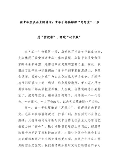 【七哥公文】2024年:在青年座谈会上的讲话:青年干部要勤掸“思想尘”、多思“贪欲害”、常破“心中贼”+更多免费公文+VX:QiGeGongWen2024