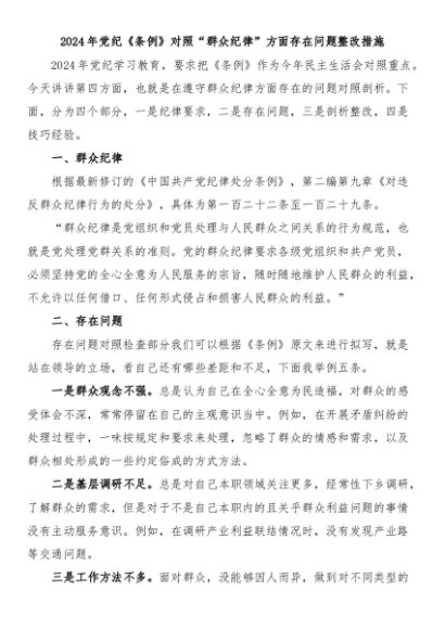 【七哥公文】2024年:2024年党纪《条例》对照“群众纪律”方面存在问题整改措施+更多免费公文+VX:QiGeGongWen2024