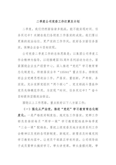 / 【七哥公文】2024年:二季度公司党委工作打算及计划+更多免费公文+VX:QiGeGongWen2024
