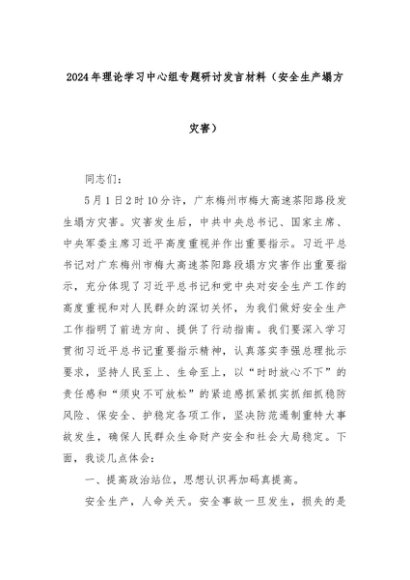 【七哥公文】2024年:2024年理论学习中心组专题研讨发言材料(安全生产塌方灾害)+更多免费公文+VX:QiGeGongWen2024