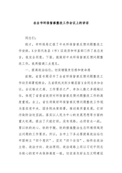 / 【七哥公文】2024年:在全市环保督察整改工作会议上的讲话+更多免费公文+VX:QiGeGongWen2024