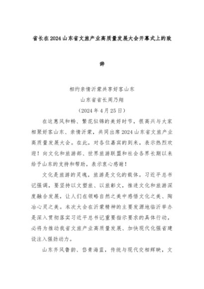 【七哥公文】2024年:省长在2024山东省文旅产业高质量发展大会开幕式上的致辞+更多免费公文+VX:QiGeGongWen2024