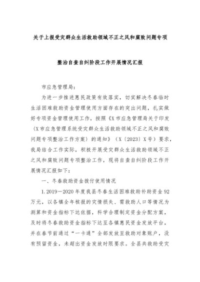 【七哥公文】2024年:关于上报受灾群众生活救助领域不正之风和腐败问题专项整治自查自纠阶段工作开展情况汇报+更多免费公文+VX:QiGeGongWen2024