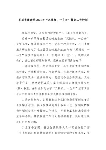 【七哥公文】2024年:县卫生健康局2024年“双随机、一公开”抽查工作计划+更多免费公文+VX:QiGeGongWen2024