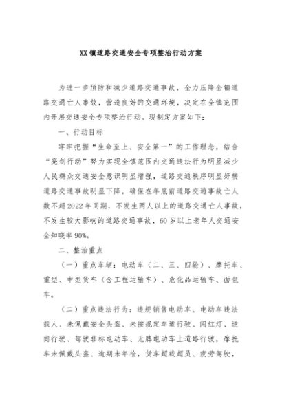 / 【七哥公文】2024年:XX镇道路交通安全专项整治行动方案+更多免费公文+VX:QiGeGongWen2024