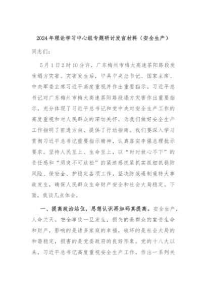 【七哥公文】2024年:2024年理论学习中心组专题研讨发言材料(安全生产)+更多免费公文+VX:QiGeGongWen2024