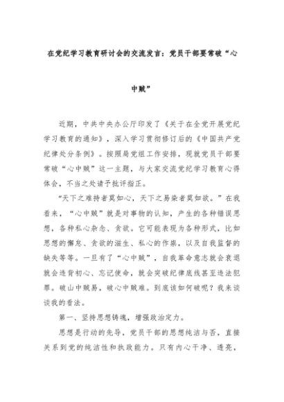 【七哥公文】2024年:在党纪学习教育研讨会的交流发言:党员干部要常破“心中贼”+更多免费公文+VX:QiGeGongWen2024