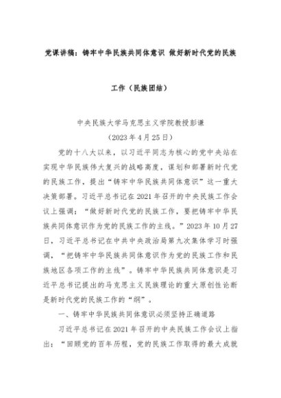 【七哥公文】2024年:党课讲稿:铸牢中华民族共同体意识 做好新时代党的民族工作(民族团结)+更多免费公文+VX:QiGeGongWen2024