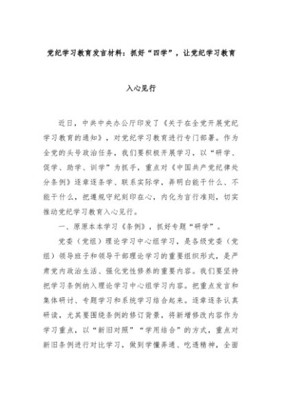 【七哥公文】2024年:党纪学习教育发言材料:抓好“四学”,让党纪学习教育入心见行+更多免费公文+VX:QiGeGongWen2024